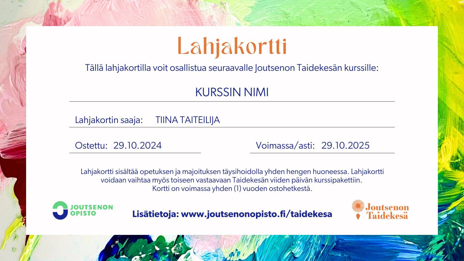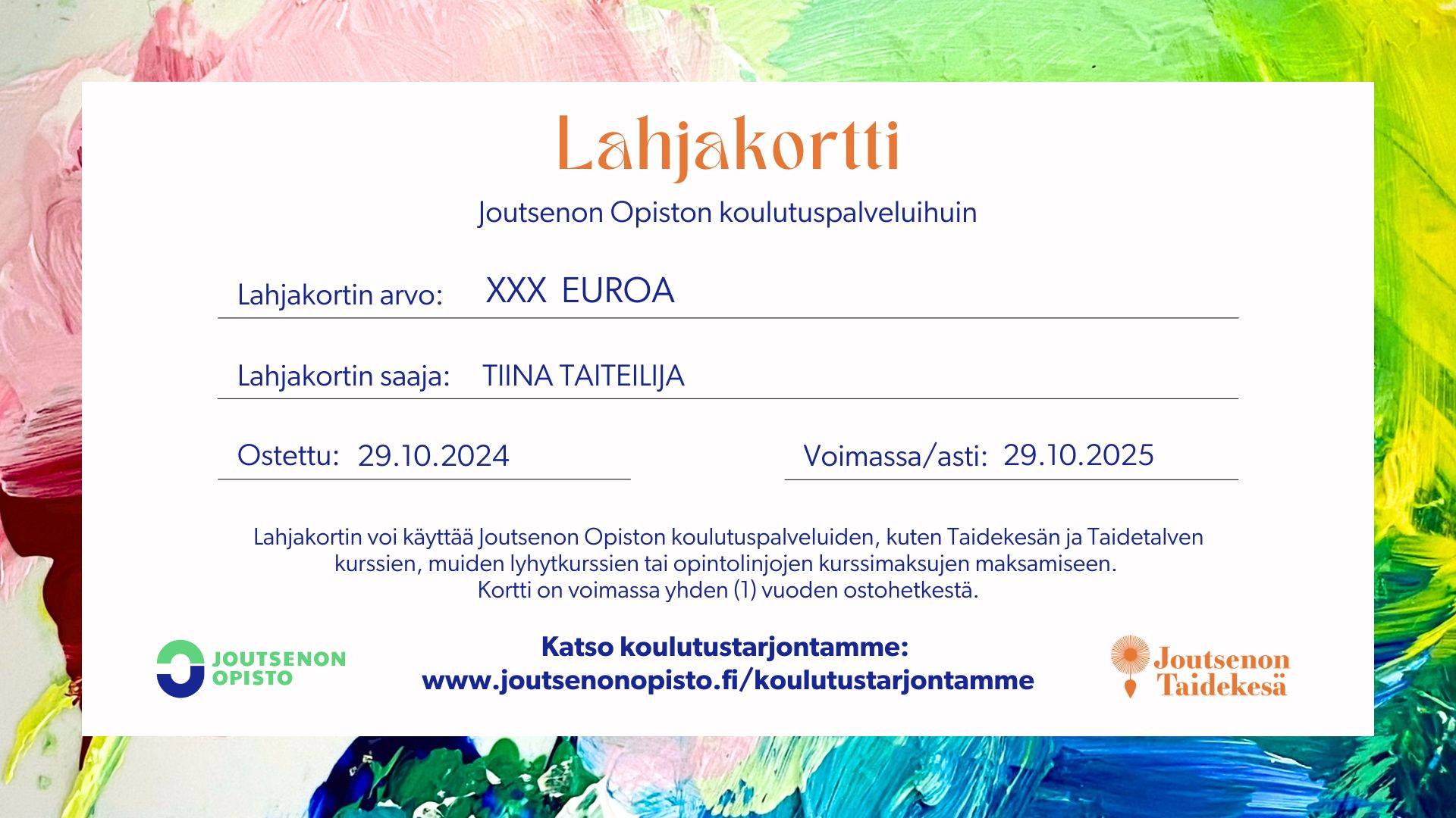 Lahjakortti käy ostetusta lahjakortista riippuen Taidekesän tai Taidetalven kurssimaksuihin, muiden järjestämiemme lyhytkurssien ja opintokokonaisuuksien kurssimaksuihin, avointen korkeakouluopintojen maksuihin tietyin rajauksin sekä ainekohtaisten opintolinjojemme opintomaksuihin. Joutsenon Opisto pidättää oikeudet muutoksiin ja mahdollisiin kurssi-/opintokohtaisiin rajauksiin, jotka kerrotaan kurssitietojen yhteydessä. Lahjakortti on voimassa yhden (1) vuoden ostopäivästä.